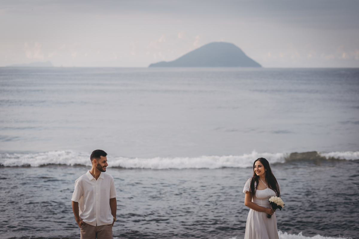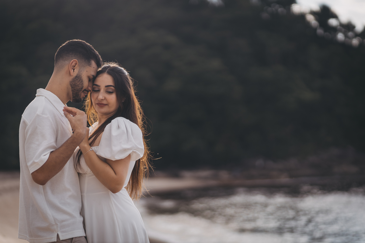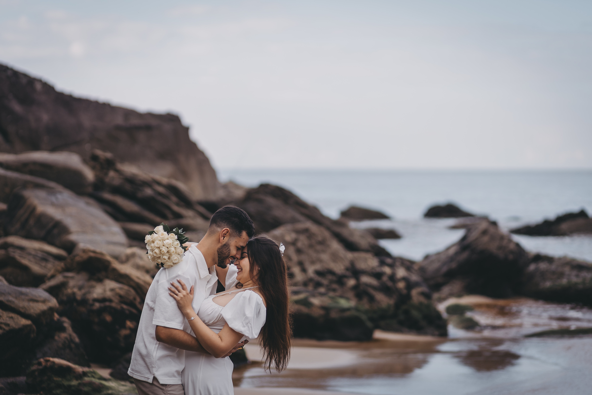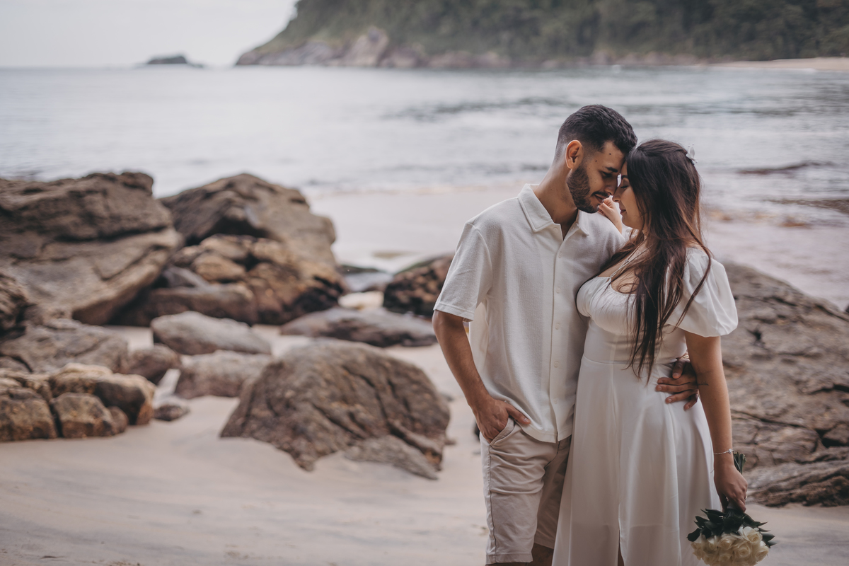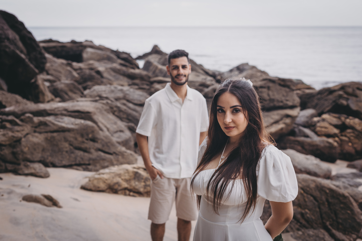 No nascer do sol da Praia da Jureia, em São Sebastião, Nathália e Vinicius chegaram achando que a timidez iria conduzir cada passo do ensaio.