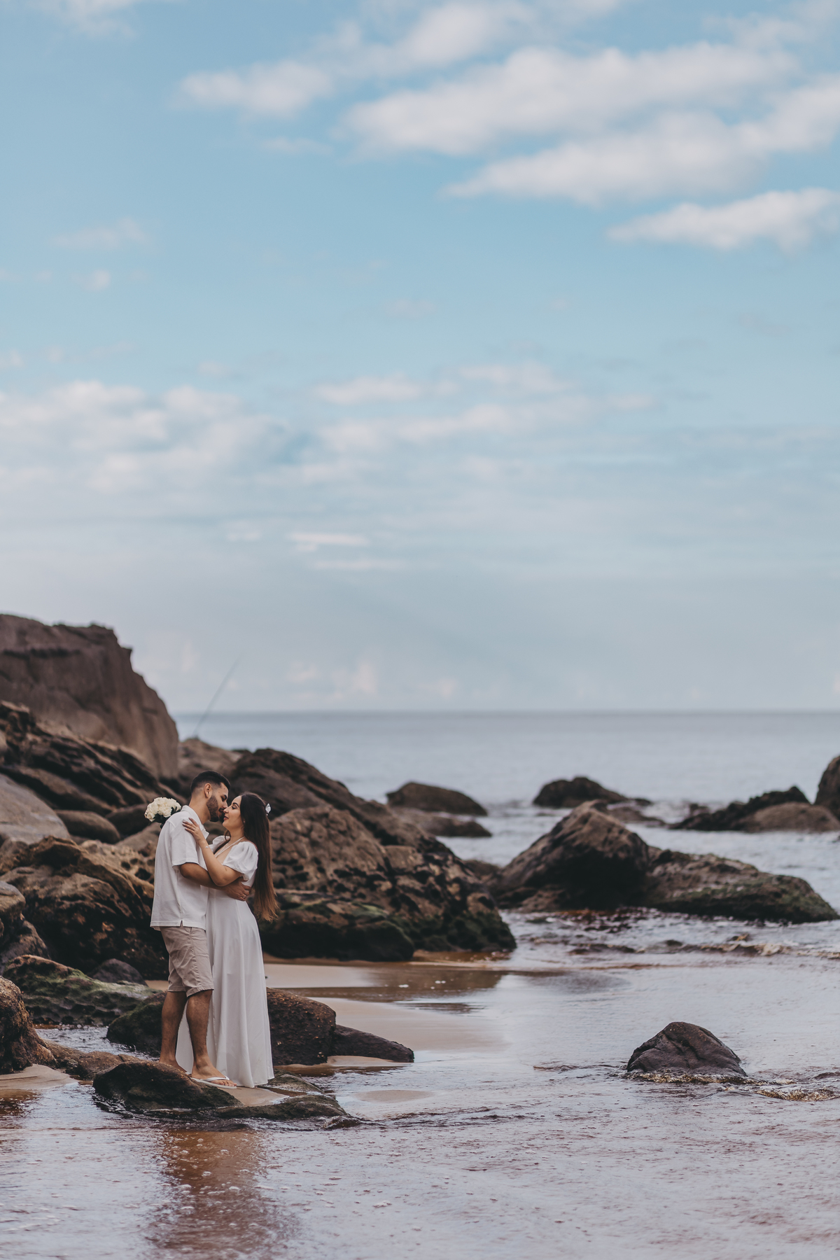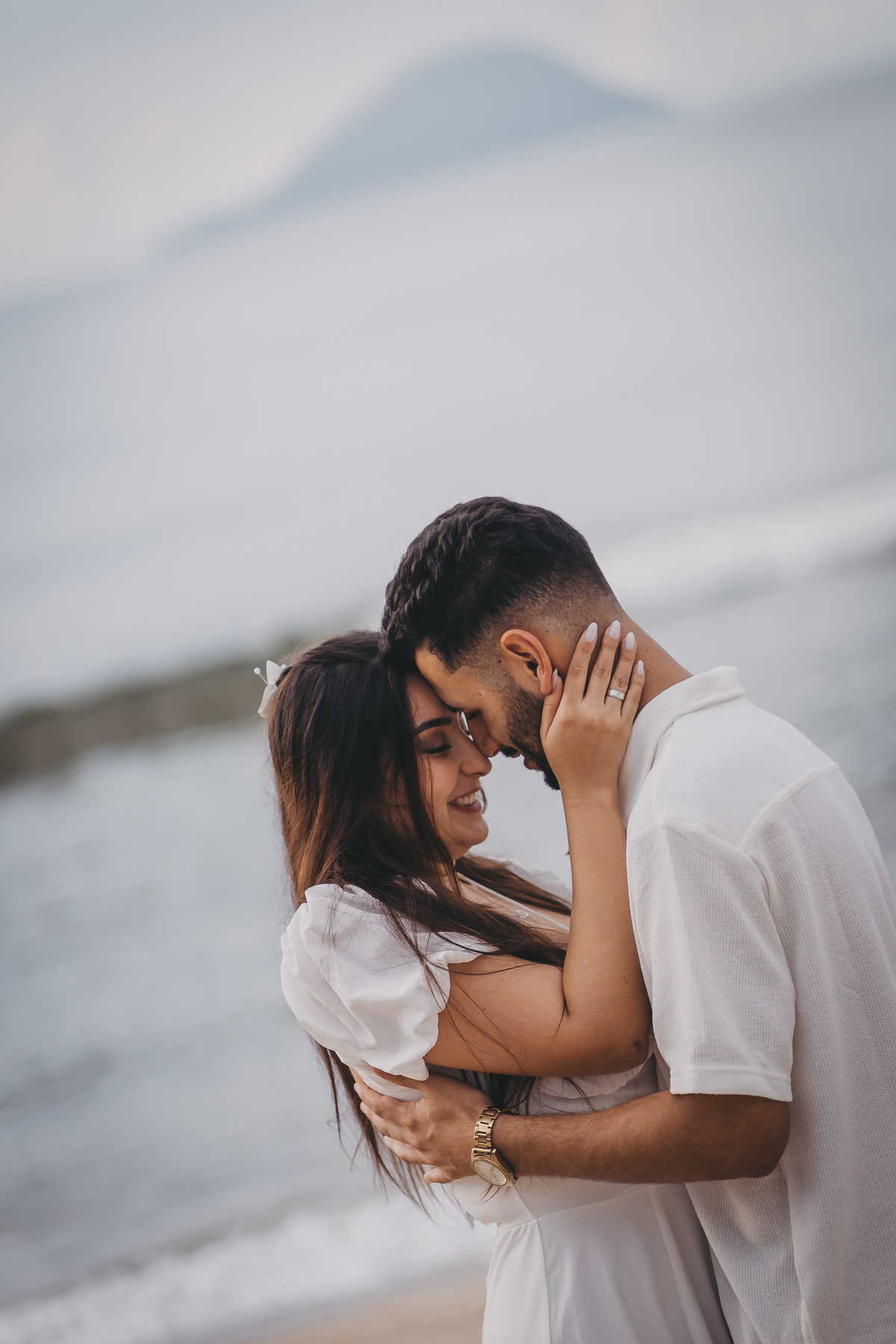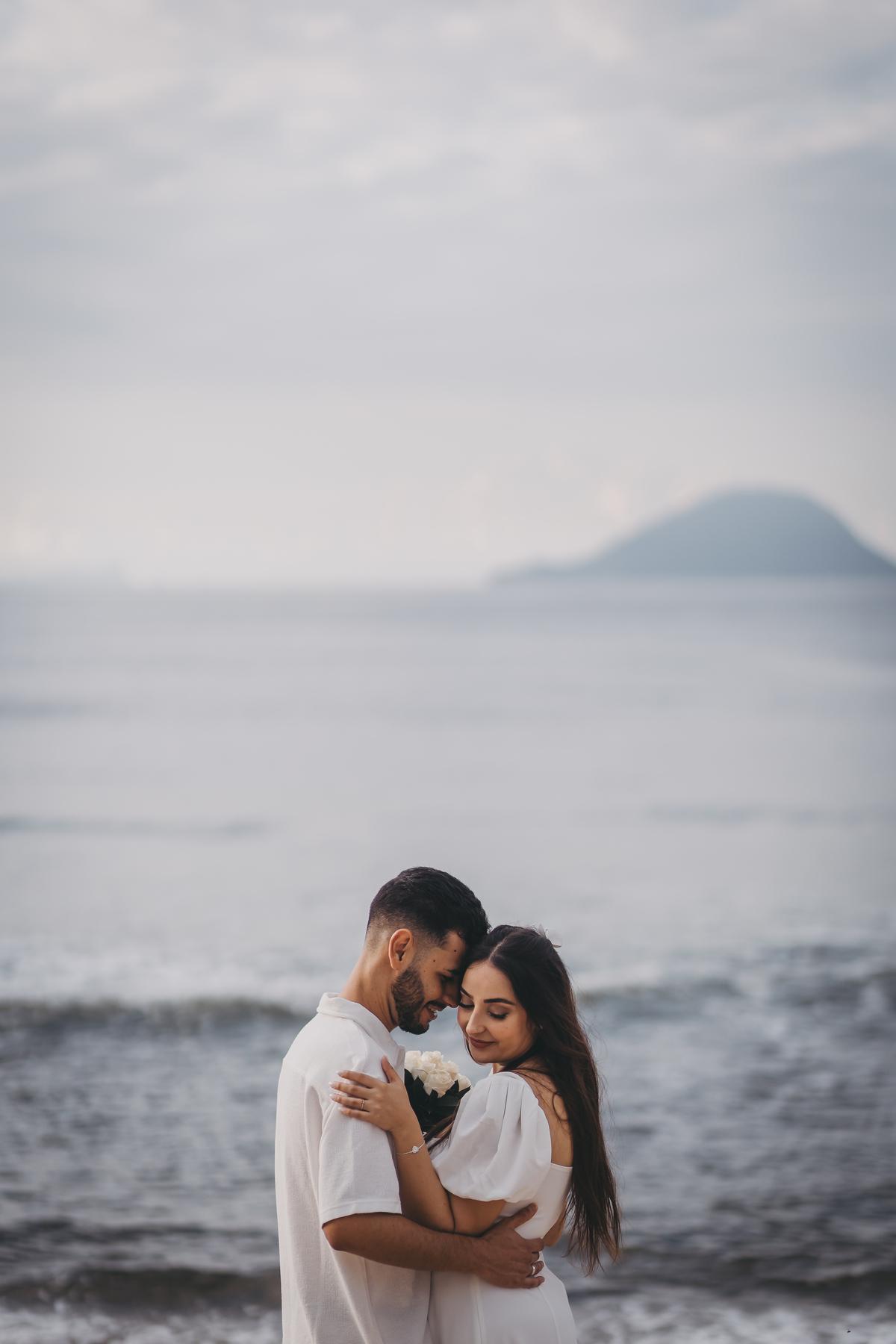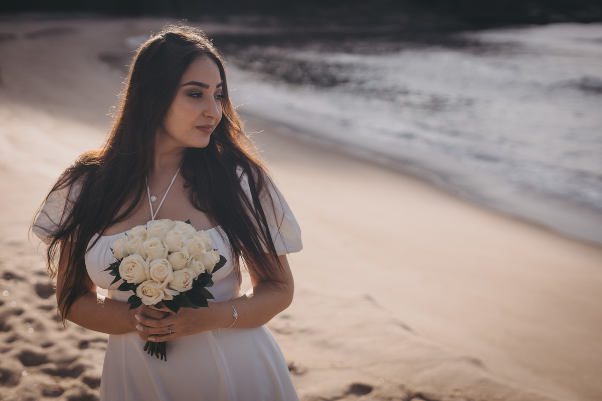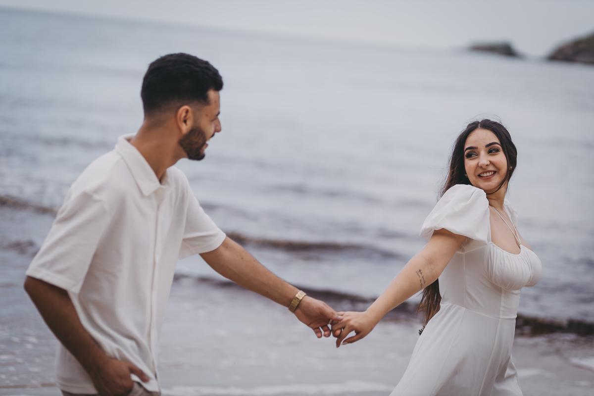 No nascer do sol da Praia da Jureia, em São Sebastião, Nathália e Vinicius chegaram achando que a timidez iria conduzir cada passo do ensaio.